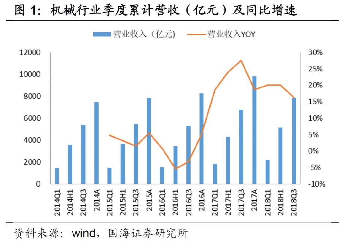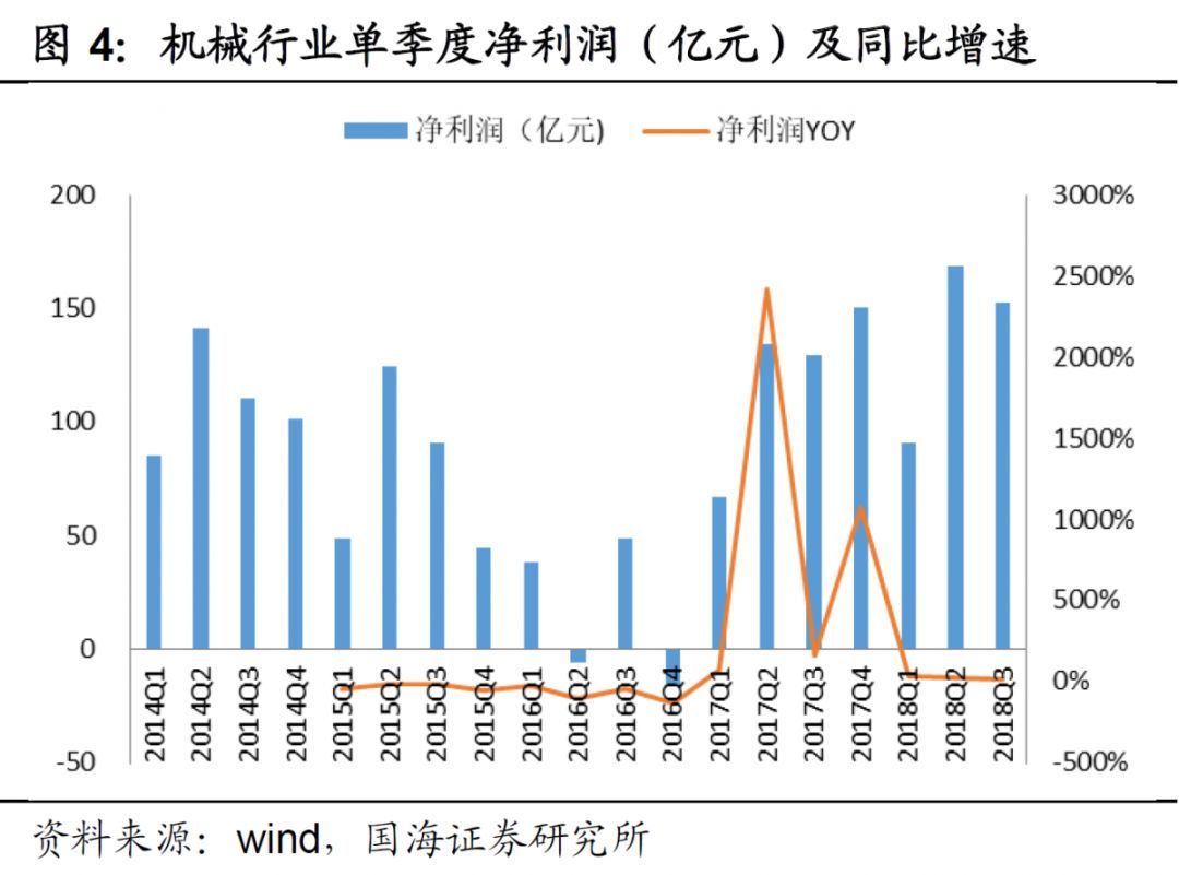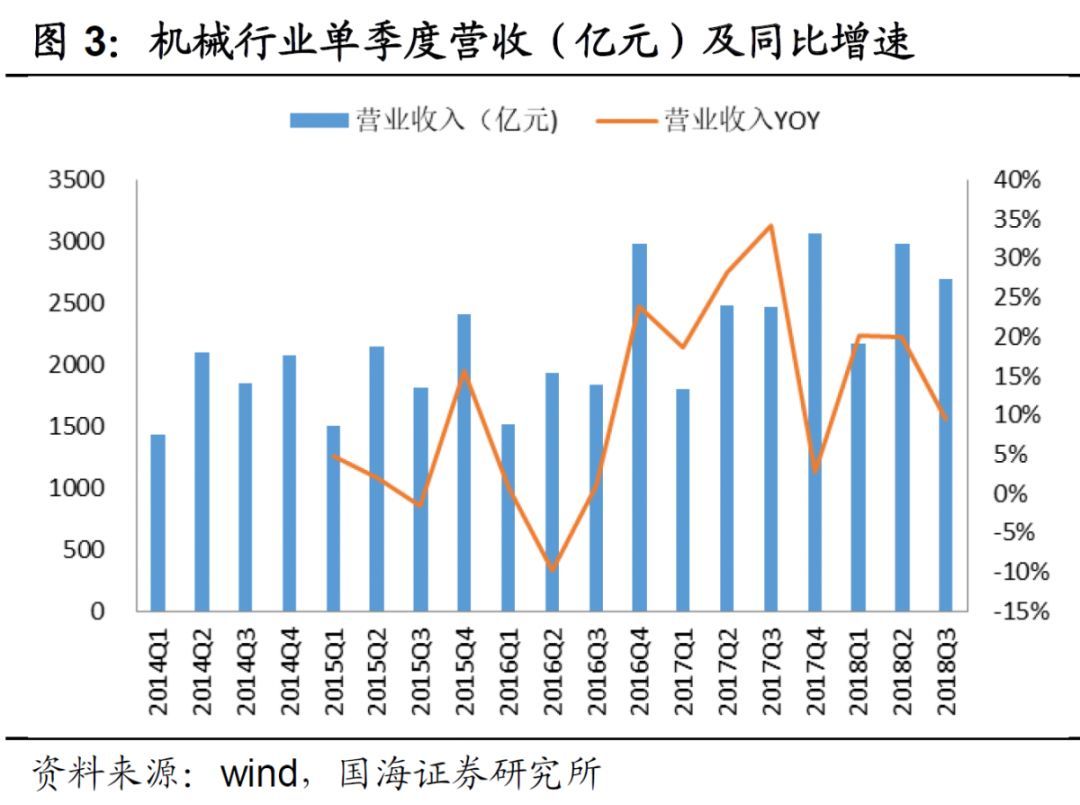 機(jī)械行業(yè)2018 年前三季度凈利潤(rùn)同比增長(zhǎng)21.72%,增速持續(xù)下滑。我們對(duì)331家機(jī)械設(shè)備類企業(yè)三季報(bào)進(jìn)行梳理,行業(yè) 2018 年前三季度累計(jì)實(shí)現(xiàn)營(yíng)業(yè)收入8400.51 億元,同比增長(zhǎng) 16.36%,其中一、二、三季度單季度收入同比增長(zhǎng)分別為20.18%、19.75%、10.14%;前三季度累計(jì)實(shí)現(xiàn)凈利潤(rùn) 476.13 億元,同比增長(zhǎng)21.72%,其中一、二、三季度單季度凈利潤(rùn)同比增長(zhǎng)分別為29.19%、22.65%、 16.65%,行業(yè)三季度業(yè)績(jī)?cè)鏊俪掷m(xù)下滑。