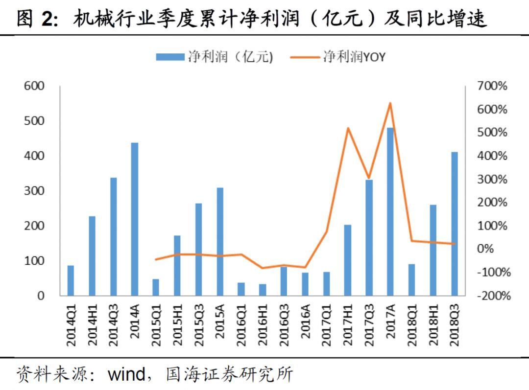 從上述四圖可知,2016 年下半年機(jī)械行業(yè)整體收入增速由負(fù)轉(zhuǎn)正,2017 年開始凈利潤(rùn)亦隨之由負(fù)轉(zhuǎn)正,標(biāo)志著一輪新周期的開始。從增長(zhǎng)率來看,2017 年形成了增長(zhǎng)率的頭部;2018 年增速開始放緩,峰值特征明顯。預(yù)計(jì) 2019 年行業(yè)整體增速惡化,維持行業(yè)“中性”評(píng)級(jí)。